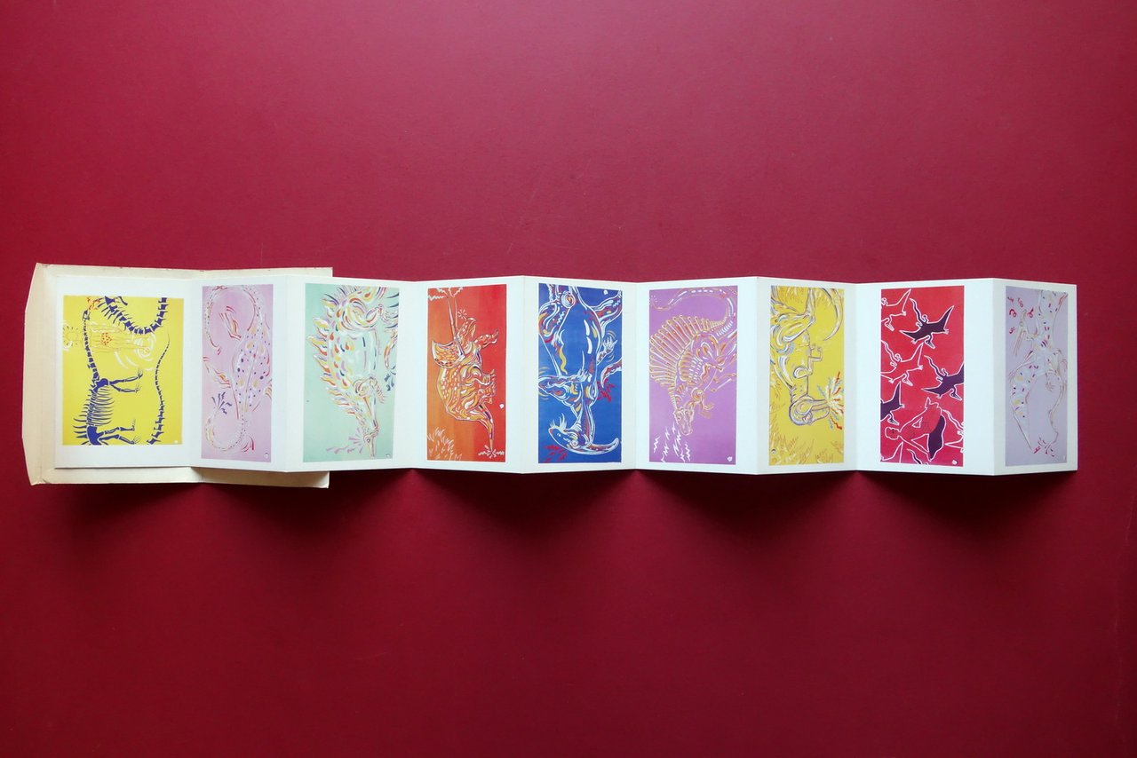 Matteo Guarnaccia, Dino Art Show" Stampa Alternativa, MIlano, s. d. ma 1988; libretto pieghevole - astuccio costituito da 9 tavole - cartoline a colori del Guarnaccia, con al retro didascalia descrittiva a stampa; al lato interno breve testo di presentazione; bella grafica a colori. Condizioni di conservazione Buone condizioni con leggere tracce d'uso, custodia con lievi tracce di sporco e poche minime bruniture. Tavole - cartoline in ottime condizioni (vedi foto). Non comune. SETT166.L24534 N P "