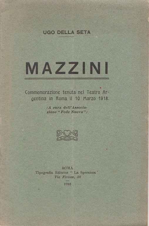 Commemorazione tenuta nel Teatro Argentina in Roma il 10 marzo 1918. A cura dell'Associazione ''Fede Nuova'' . 16mo. pp. 62. . Molto buono (Very Good). . . .