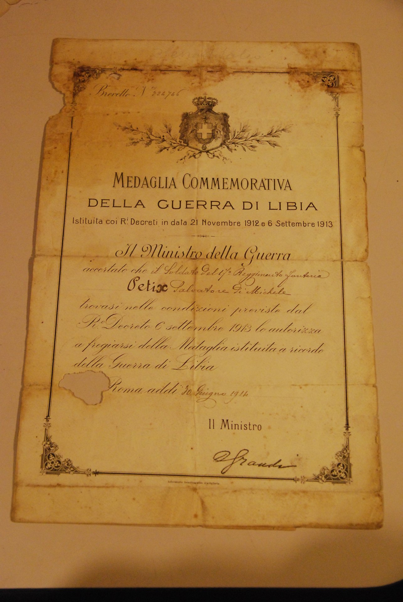 attestato di medaglia commemorativa della guerra di libia. 1914 .