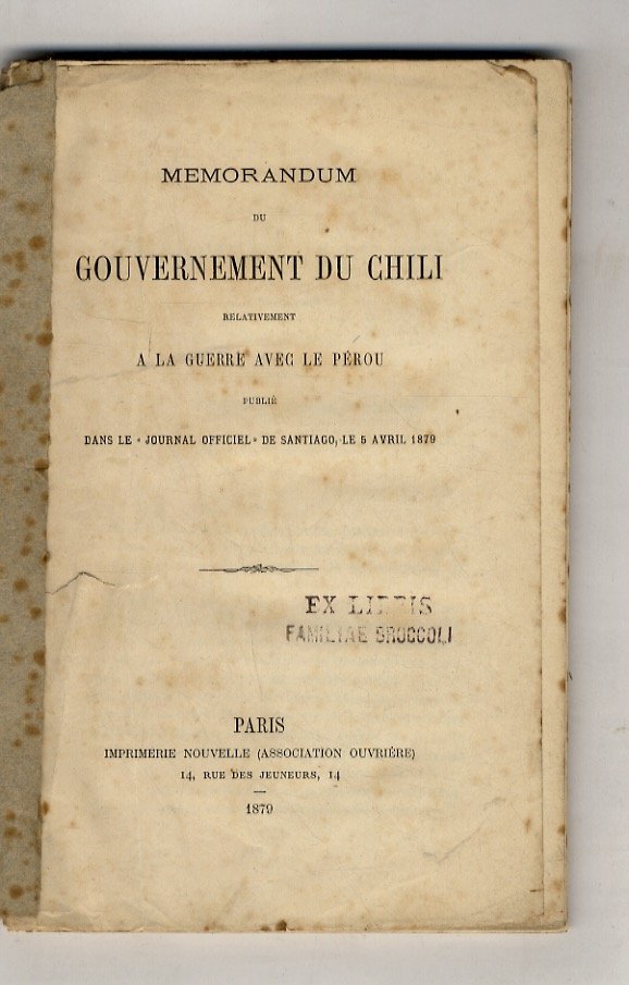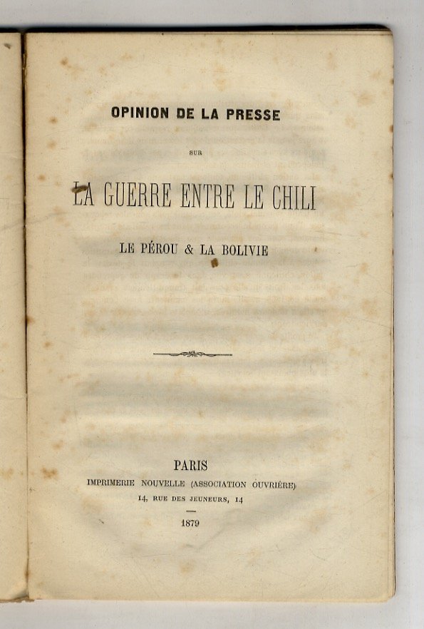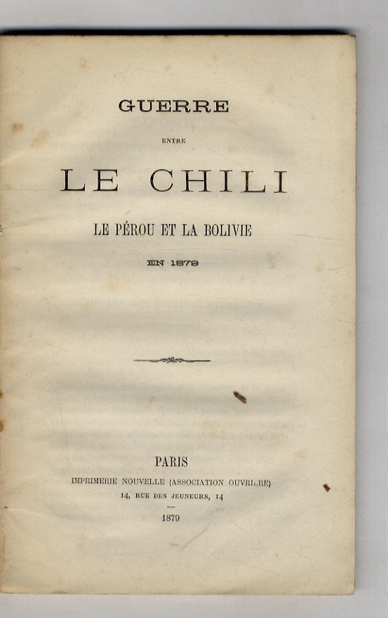 Memorandum du gouvernement du Chili relativement a la guerre avec le Pérou, publié dans le "Journal Officiel" de Santiago, le 5 avril 1879. [Segue con proprio frontespizio:] Guerre entre le Chili, le Perou & la Bolivie en 1879. [Segue con proprio frontespizio:] Opinion de la presse sur la guerre entre le Chili, le Perou & la Bolivie.