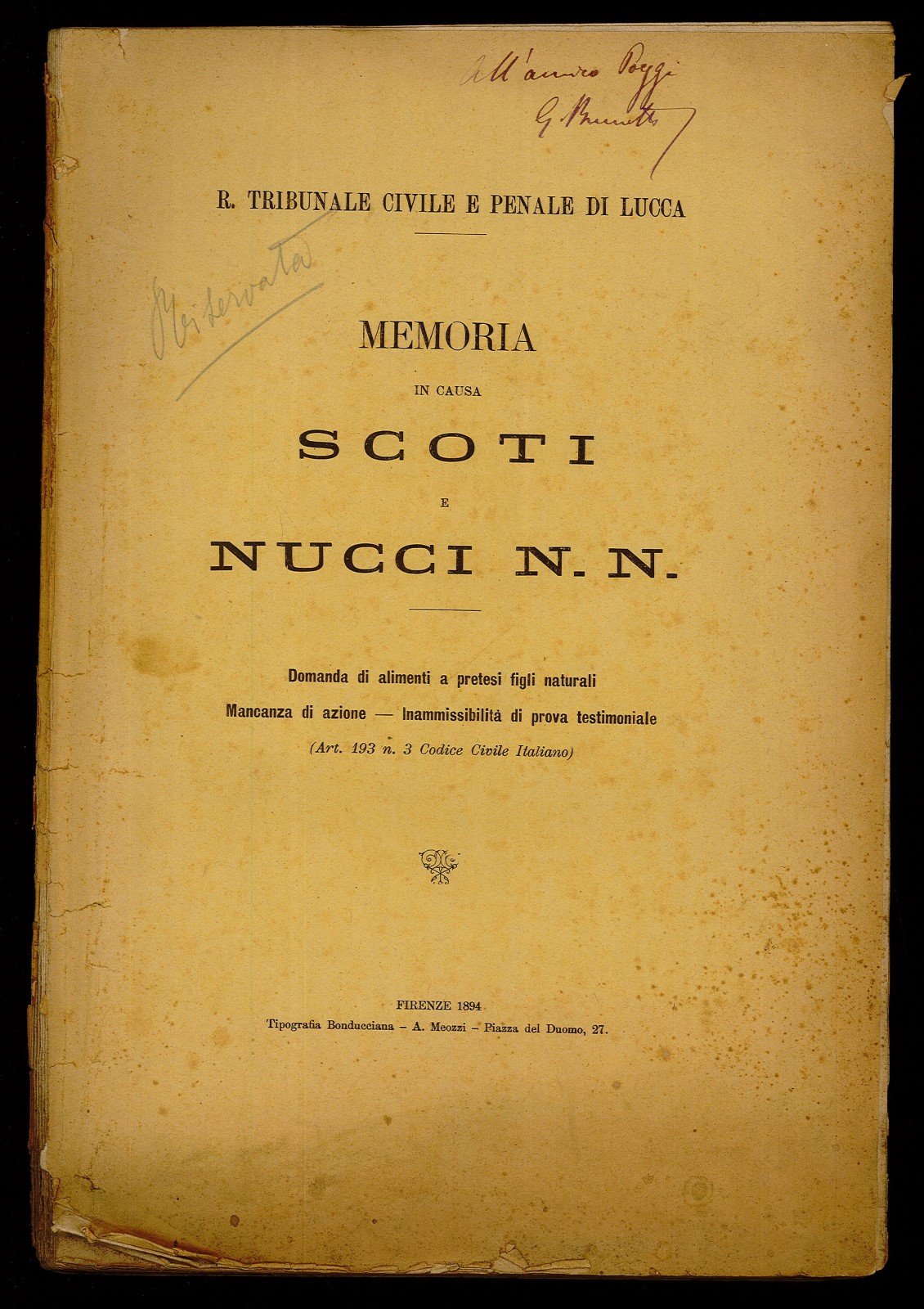 Memoria in causa Scoti e Nucci N. N. | Libri antichi e moderni | Tribunale Civile E Penale Di Lucca, Tribunale Civile e Penale di Lucca