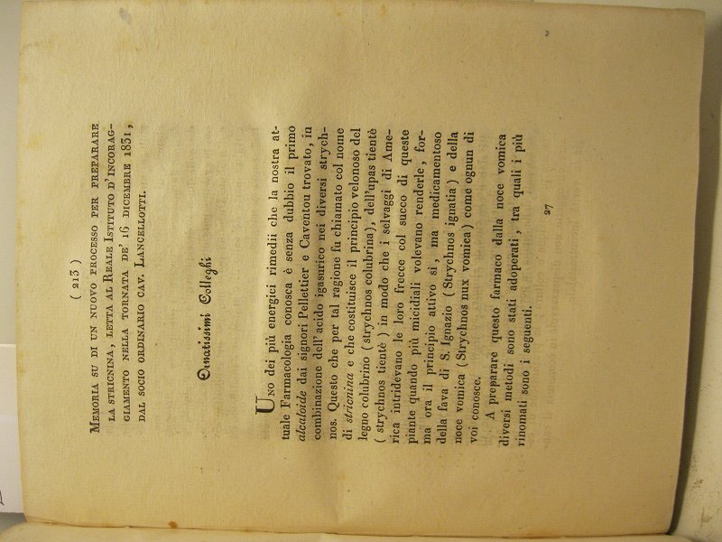 Memoria su di un nuovo processo per preparare la stricnina. | Libri antichi e moderni | Lancellotti Francesco