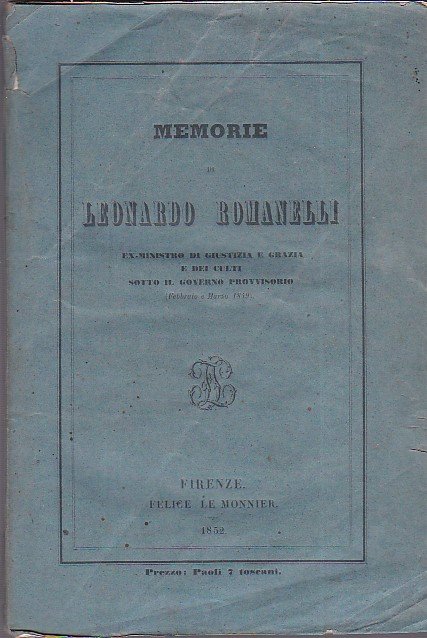 In-8°, pp. 253, (2) di indice e di errata, brossura editoriale azzurra con velina protettiva. Perfetto esemplare. Prima edizione di queste memorie autobiografiche del patriota e statista aretino risorgimentale che fu anche Ministro di Giustizia del governo provvisorio di Firenze nel 1848. Lemmi, 240.