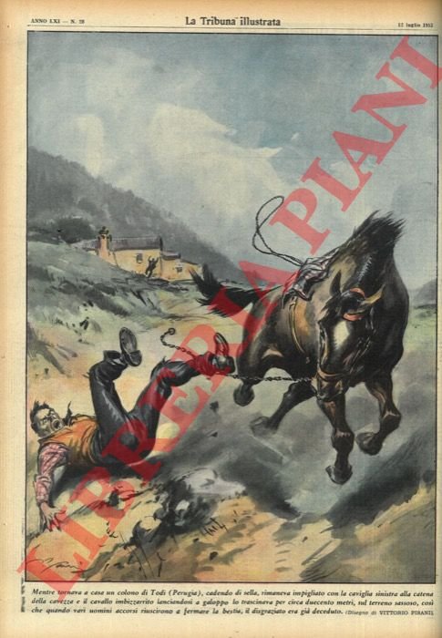 Mentre tornava a casa un colono di Todi (Perugia), cadendo di sella, rimaneva impigliatocon la caviglia sinistra alla catena della cavezza e il cavallo imbizzarrito lanciandosi a galoppo lo e trascinava per circa duecento metri. . | Libri antichi e moderni | Pisani Vittorio