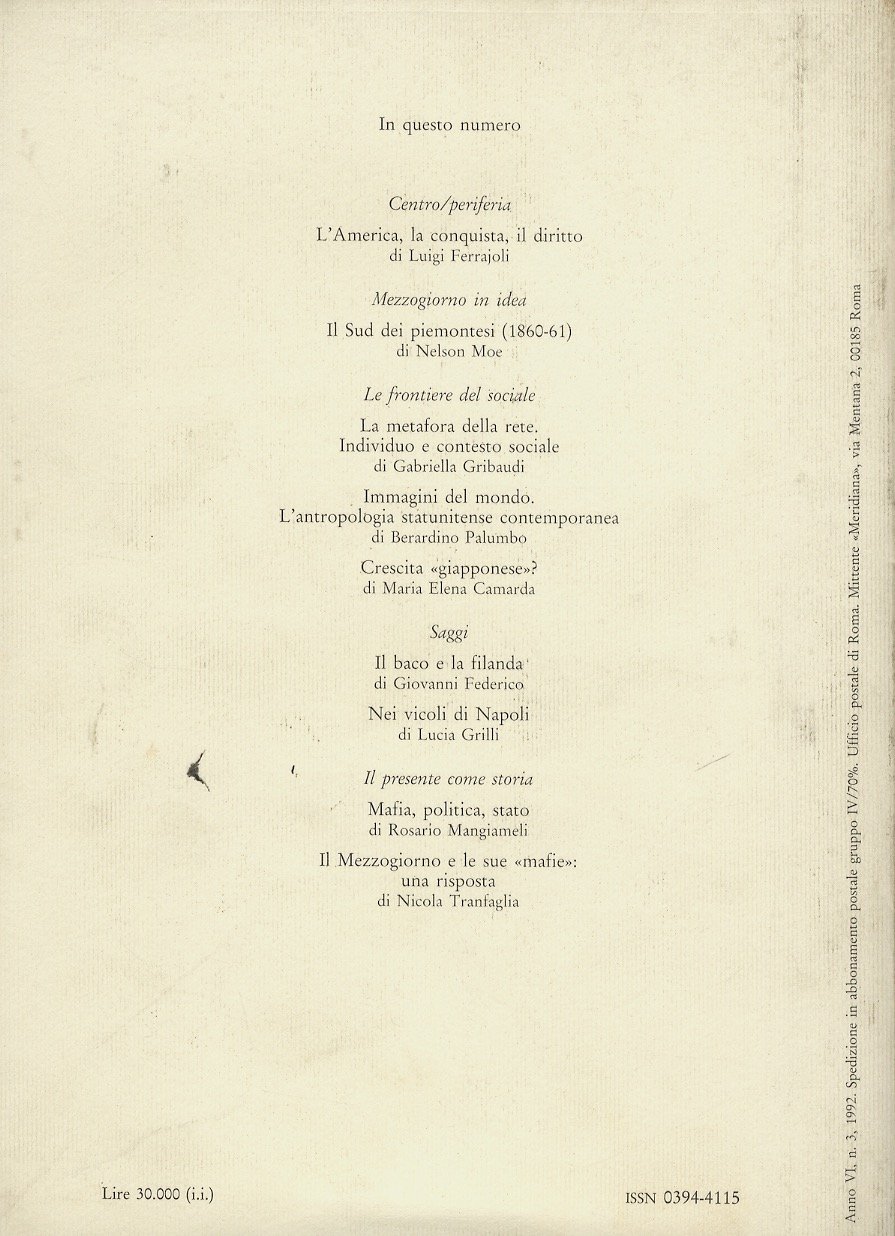 Roma, Istituto Meridionale di Storia e Scienze Sociali, 1992, in-8, br. editoriale, pp. 297, [3]. Dall'indice: Luigi Ferraoili "L'America, la conquista, il diritto. L'idea di sovranità nel mondo moderno", Nelson Moe "Altro che Italia! Il Sud dei Piemontesi (1860-61)", Maria E. Camarda "Crescita giapponese? Taiwan, Corea, Hong-Kong, Singapore", Giovanni Federico "Il baco e la filanda. Il mercato dei bozzoli in Italia (secoli XIX e XX)". Lucia Grilli "Nei vicoli di Napoli. Reti sociali e percorsi individuali", ecc.