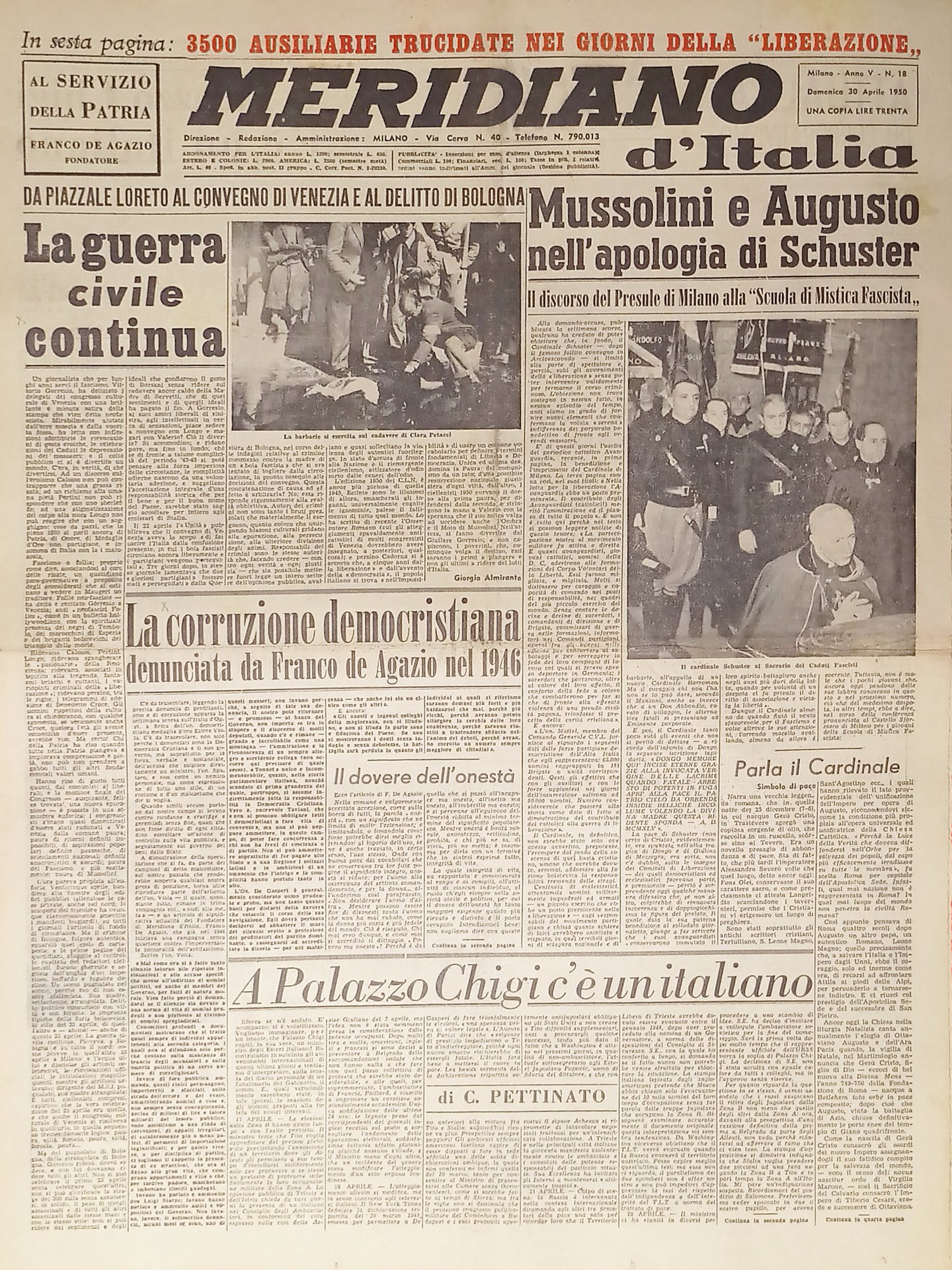 Meridiano d'italia N. 18 - 1950 Mussolini e Augusto nell'apologia di Schuster | Libri antichi e moderni |