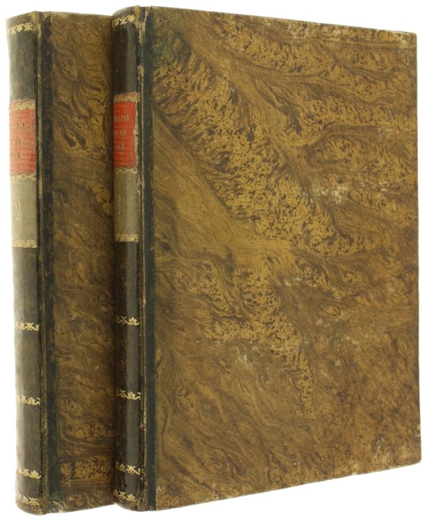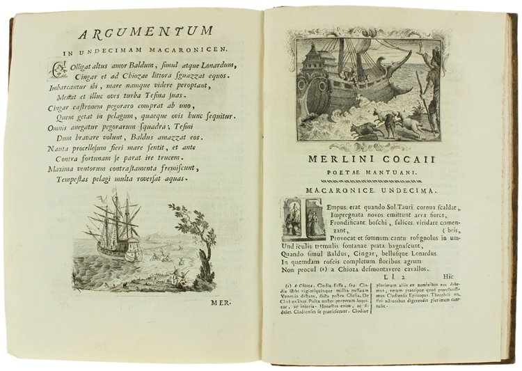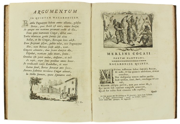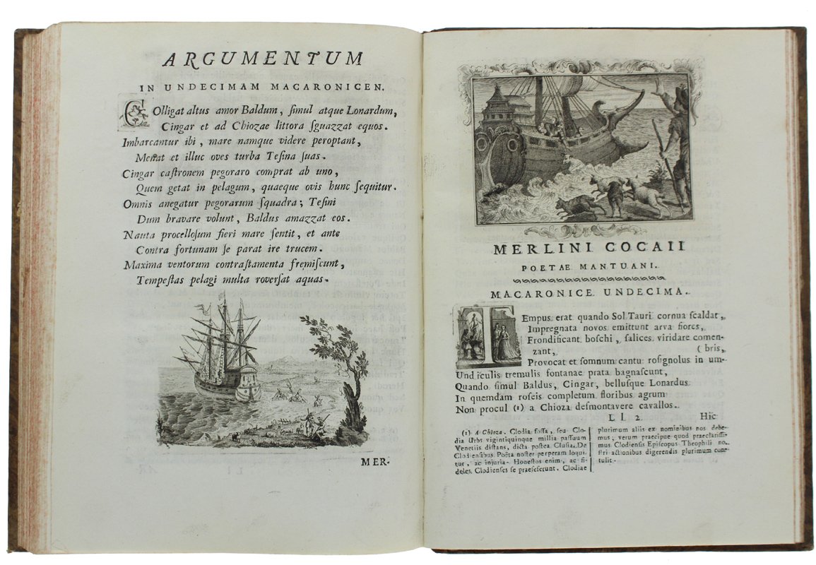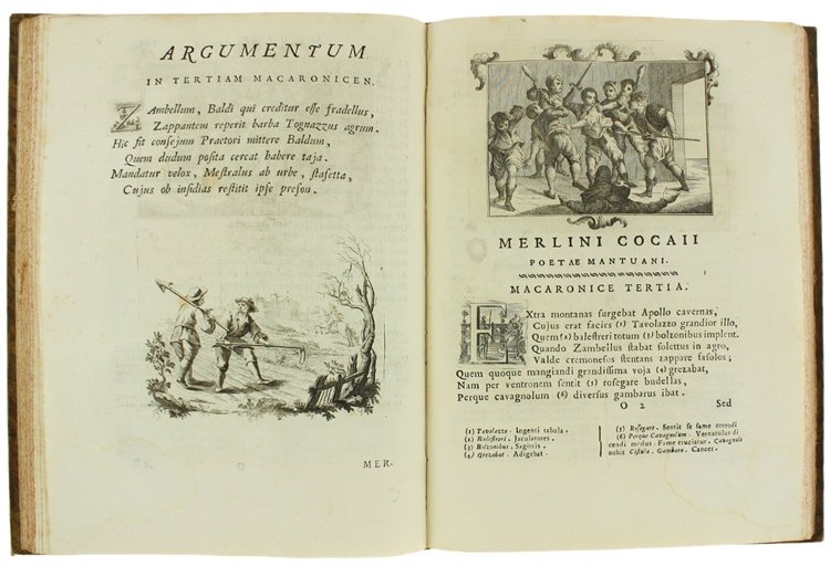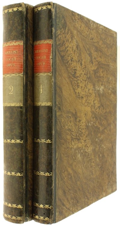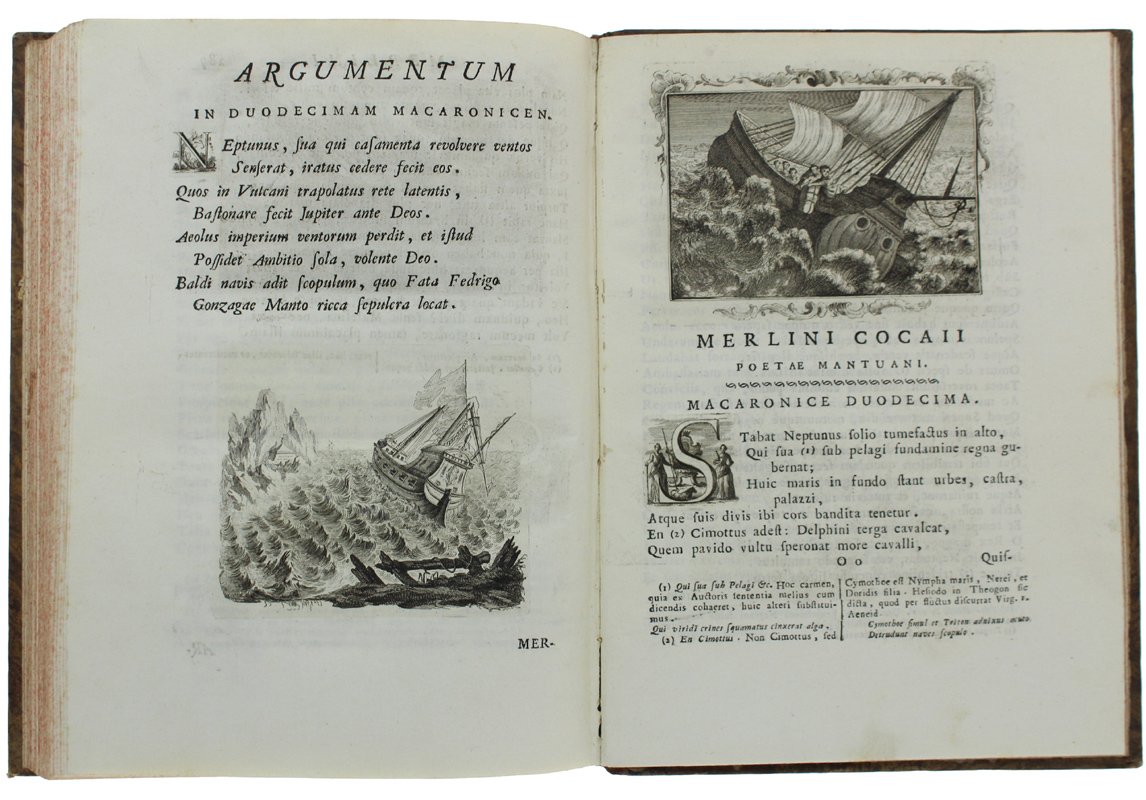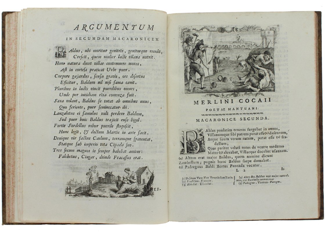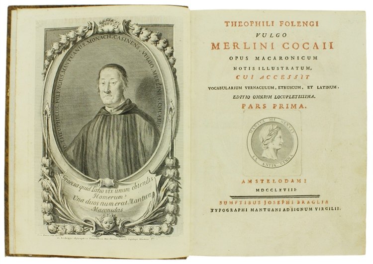 (Codice AN/1966) Due volumi In 4° (cm 28), (1)LVI-307(18), (6)411 pp. Bellissima edizione figurata. Primo frontespizio in rosso e nero con marca tipografica, ritratto dell'Autore inciso da D.Cagnoni, grande tavola genealogica con stemma ripiegata. Con deliziose fini incisioni in rame: 51 capilettera figurati e 74 vivaci vignette (grandi testate e finalini scenografici). Con ampie note biografiche. Contiene, oltre all'Opus Macaronicum, la Zanitonella, la Moscheide e gli Epigrammi, e in fine il vocabolario mantovano, toscano, latino. Cfr. Brunet, II/1319; Olschki, Choix, 5734. Nitida impressione su bella carta, esente da ingialliture. Legatura mezza pelle antica, fregi e titolo oro, doppi tasselli, tagli colorati. La più accurata e pregiata edizione completa delle opere. ~~~ SPEDIZIONE IN ITALIA SEMPRE TRACCIATA