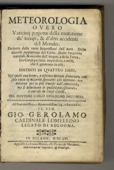 Meteorologia overo Vaticinij perpetui della mutatione de' tempi, & d'altri accidenti del mondo [.] Distinti in quattro libri [.] Del dottore Carlo Guglielmo Ingegneri. | Libri antichi e moderni | Ingegneri Carlo Guglielmo.