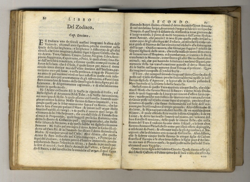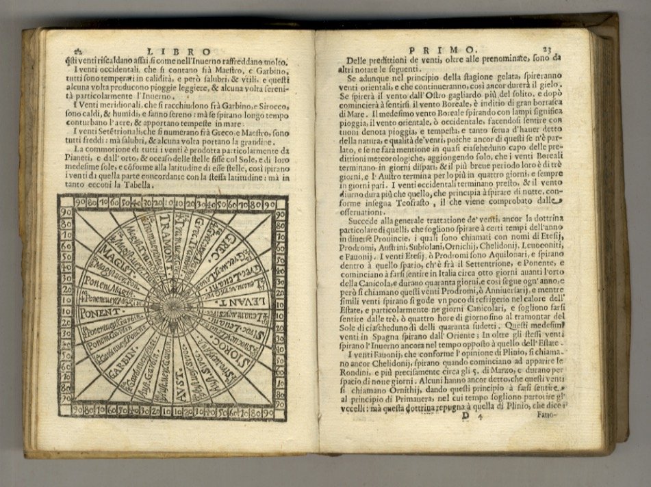 In Milano, appresso Lodovico Monza, alla Piazza de' Mercanti, 1656, in-8, legatura coeva in piena pergamena floscia, titolo manoscritto in epoca antica al dorso, pp. [22], 334, [18]. Con una rosa dei venti in xilografia n.t. Colophon: In Milano: Appresso Lodovico Monza, alla Piazza de' Mercanti, 1656, con marca tipografica. Prima ed unica edizione, prima tiratura, con la data 1656 sia al frontespizio che al colophon, invece che 1657 (variante non descritta in ICCU). La trattazione è dedicata ai vari fenomeni meteorologici, all'astronomia, alla fisica terrestre, con curiosi capitoli sui terremoti, le virtù delle gemme, i presagi, gli animali, le piante, etc. Riccardi, Correz. ed Aggiunte, Serie Ia, col. 43; Vinciana, Aut. Ital. del '600, n. 2195.Bell'esemplare.