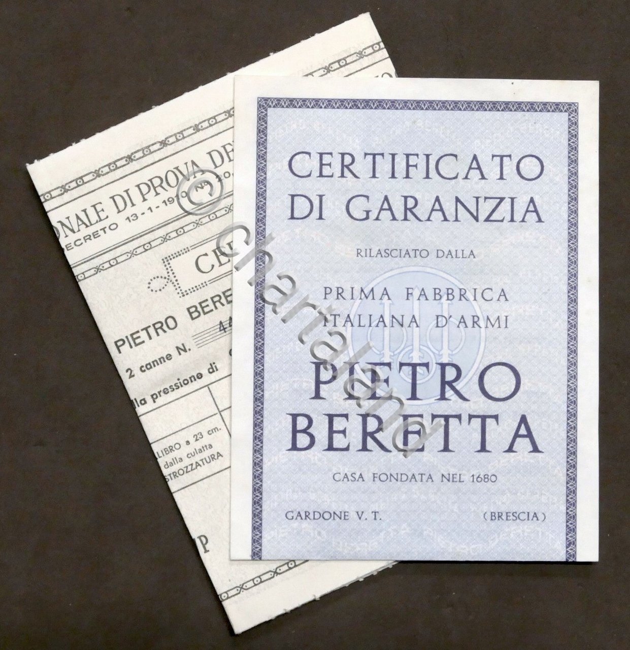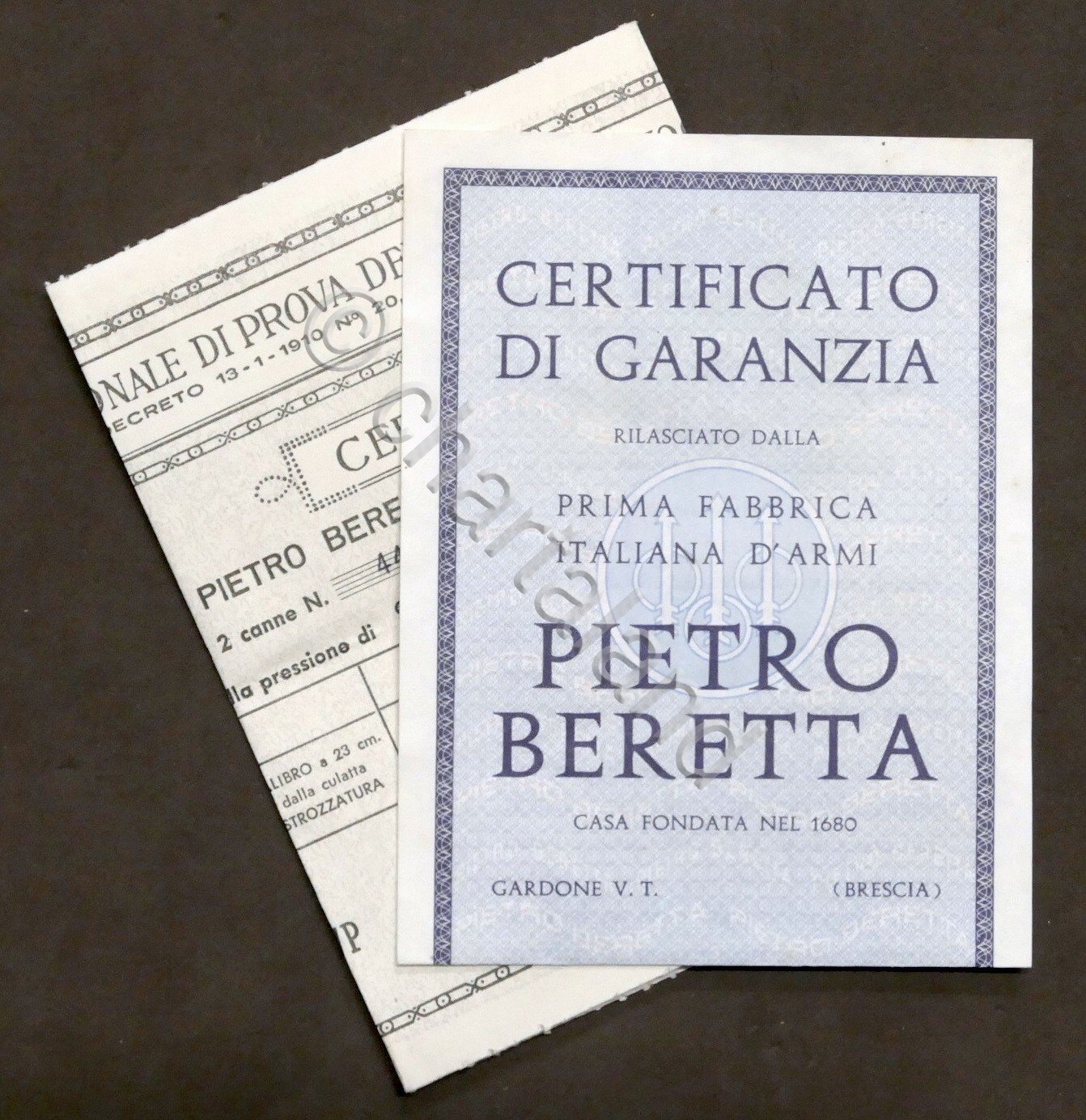 Certificato di Garanzia rilasciato dalla Prima Fabbrica Italiana d'Armi Pietro Beretta - Fucile Cal. 12 a 2 canne - 1960 ca. Lingua italiana. Condizioni molto buone.