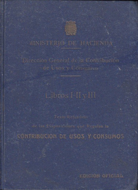 Ministerio de Hacienda. Texto refundido de las disposiciones que regulan la Contribución de Usos y Consumos. Libros I-II y III. en un sólo tomo. Edición Oficial. Tela. 24x17. Edición del Colegio Huerfanos de Hacienda.