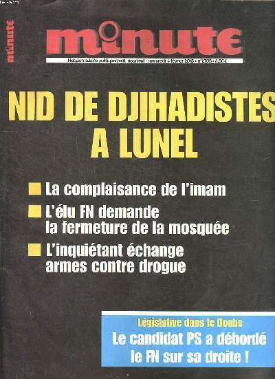 Minute N° 2705 du mercredi 4 février 2015 Nid de djihadiste à Lunel Sommaire: Nid de djihadiste à Lunel; La complaisasnce de l'islam; L'inquiétant échange armes contre drogue; Le candidat PS a débordé le FN sur sa droite ! .