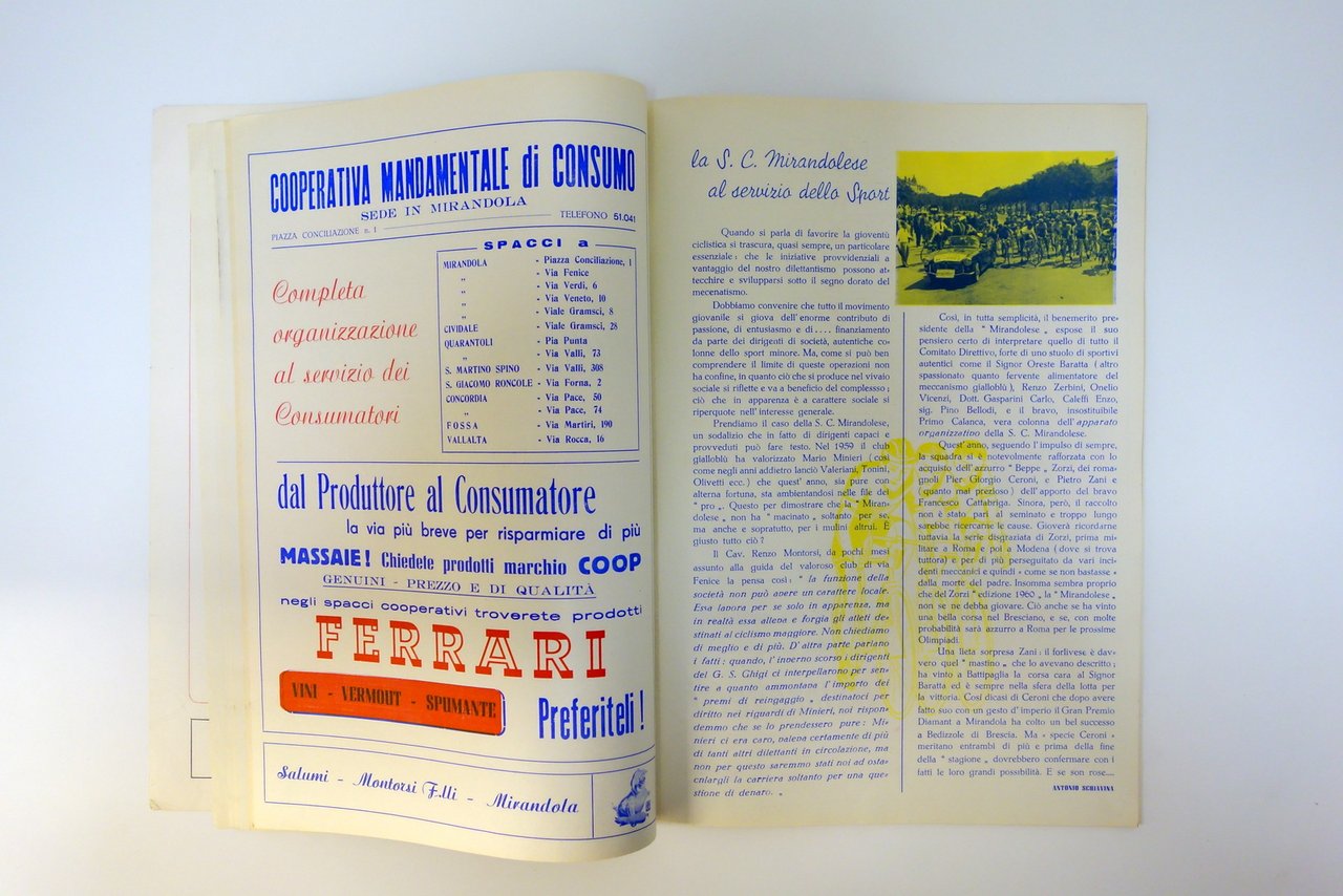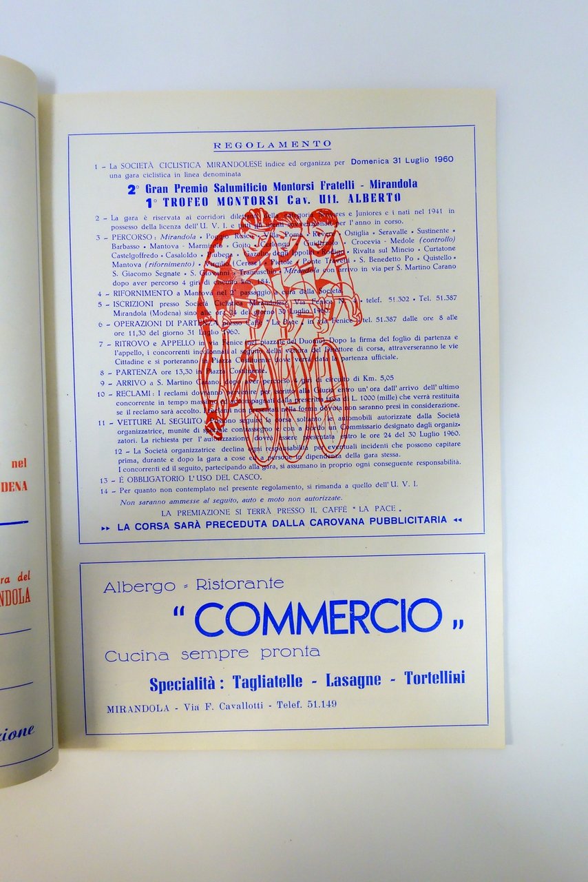 Rivista - fascicolo di presentazione dell'omonima competizione ciclistica mirandolese, ricco di illustrazioni e soprattutto di inserzioni pubblicitarie a colori di esercizi commerciali e aziende del territorio. Raro, molto gradevole.