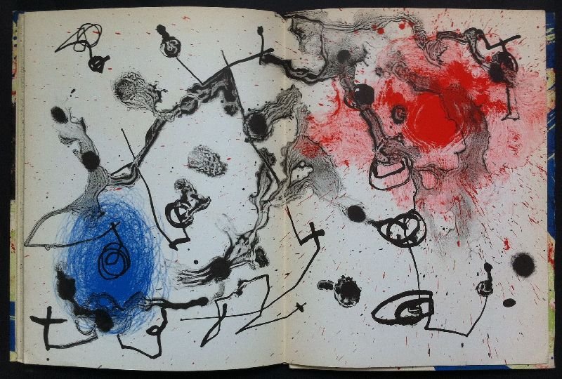 Volume stampato in occasione della mostra di Joan Mirò presso la Pierre Matisse Gallery, New York 31 ottobre - 25 novembre 1961. Testo in francese di Yvon Taillandier. 6 pochoirs sciolti a colori e 23 in bianco e nero. Elenco delle tavole. Allegato un fascicolo stampato su carta pesante azzurra con la traduzione in inglese dei testi e una tavola sciolta ripiegata con riproduzione di una ceramica dell'Artista. Una delle 1200 copie con 2 litografie originali a colori, di cui una in copertina su quattro pagine (cm 47x96) ed una sciolta su doppia pagina (cm 31x47) Stampato presso la tipografia Fequet et Baudier. Tavole in nero e a colori stampate presso l'Ateliers Daniel Jacomet. Copertine e litografia originale doppia tirate presso l'Atelier Maeght. Esemplare 992. 4to (cm 31x24). pp. 32 non numerate + tavole. . Ottimo (Fine). . Edizione di XXV+50+1200 es. numerati e firmati. Mirò Books [Cramer, 1989] Cramer Patrick, Joan Mirò. The illustrated books: Catalogue raisonné. Geneva, Cramer, 1989.