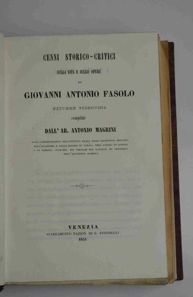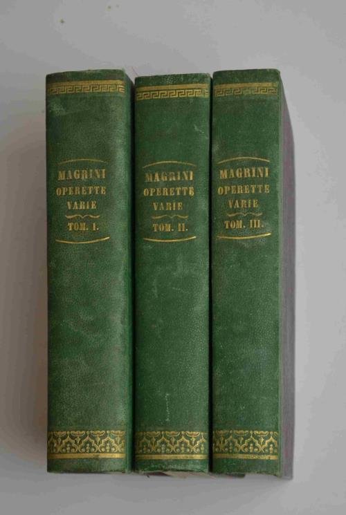 Tre volumi di cm. 22, solida legatura coeva in mezza percallina verde, dorsi lisci con titoli e filetti in oro. Sono presenti alcune tavole incise. Ottimo stato di conservazione. La presente raccolta comprende 44 opere dell'abate e storico Antonio Magrini pubblicate attorno alla metà dell'800. Si tratta praticamente di tutto il pubblicato di questo poligrafo, attento studioso di storia vicentina. Fra le pubblicazioni contenute ricordiamo: Cenni storici sulla vita e sulle opere di Giovanni Antonio Fasolo pittore vicentino (1851); Dell'architettura in Vicenza. (1845); Il teatro Olimpico nuovamente descritto ed illustrato (1847); Intorno il vero architetto del ponte di Rialto (1854); Intorno Tomaso Formenton, ingegnere vicentino nel secolo XV; Il museo civico di Vicenza solennemente inaugurato (1855); Notizie storico-descrittive della chiesa cattedrale di Vicenza (1848); I Santi patroni di Vicenza. Cenni descrittivi (1866).
