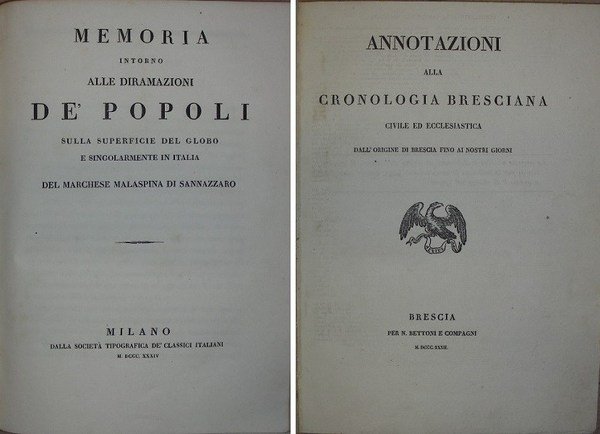 MISCELLANEA DI STORIA BRESCIANA: 1 - AAVV. ANNOTAZIONI ALLA CRONOLOGIA BRESCIANA civile ed ecclesiastica dall’origine di Brescia fino ai nostri giorni. Brescia, Bettoni, 1832. 2 - MALASPINA Di Sannazaro. MEMORIA intorno alle diramazioni de’ popoli sulla superficie del globo e singolarmente in Italia. Brescia, Soc. Tip., 1834. 3 - BEDOSCHI Paolo. DISCORSO FUNEBRE ISTORICO recitato nelle solenni esequie dell’immortale Stefano Antonio Morcelli Prevosto di Chiari. il giorno sette Gennaio 1821. Brescia, Tellaroli, 1821. 4 - DEANI Pacifico. ELOGIO FUNEBRE dell’Abate Stefano Antonio Morcelli prevosto di Chiari. Brescia, Tellaroli, 1821. 5 - BAZZONI Alberto Francesco. ORAZIONE funebre di Stefano Antonio Morcelli proposto V. F. di Chiari letta il | Libri antichi e moderni | Autori Vari