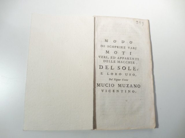 Modo di scoprire varj moti veri ed apparenti delle macchie del sole e loro uso | Libri antichi e moderni | Muzano Mucio
