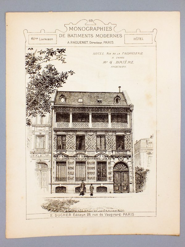 1 extrait in-folio (36x28 cm), 60me livraison, E. Ducher éditeur, Paris, s.d. (circa 1895), 4 pp. (pp. 69 à 72) Très bon état pour cet extrait de la revue d'architecture "Monographies de Bâtiments Modernes", relatif à un hôtel particulier du XVIe arrondissement. On peut lire que cet immeuble "[.] fait partie d'un groupe d'hôtels particuliers construits au même moment, à deux pas du Bois de Boulogne, pour servir de demeure à des familles aisées ayant chevaux et voitures".