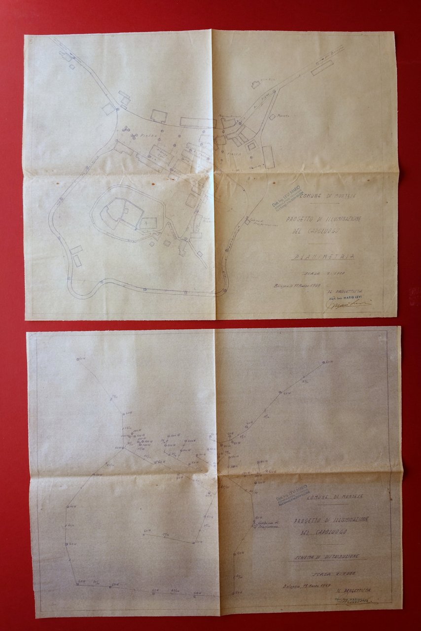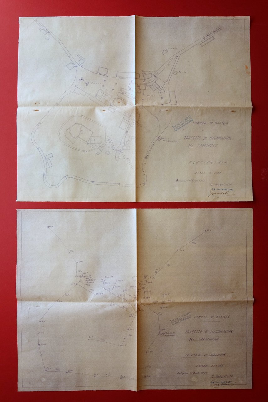 Perizie - lettere - piante, Comune di Montese perizie - lettere - comunicazioni per la ricostruzione dell'impianto di illuminazione pubblica del centro urbano e dell'area del comune con presenza di piante ripiegate 1949 1949; serie di 8 fascicoli dattiloscritti, tutti di alcune carte unite al dorso mediante spillature; presenti anche 4 piante ripiegate pi√π volte, di cui 2 sciolte e 2 unite al termine di due fascicoli (vedi foto). Formato vario. Condizioni di conservazione Insieme in buone condizioni con tracce d'uso, margini e angoli minimamente sgualciti, minuscole macchiette di ruggine in corrispondenza di qualche spillatura. Interessante insieme di perizie, resoconti, studi per la ricostruzione dell'impianto di illuminazione pubblica del centro urbano e del comune di Montese. Con 4 piante ripiegate pi√π volte. SC03.D17388 N