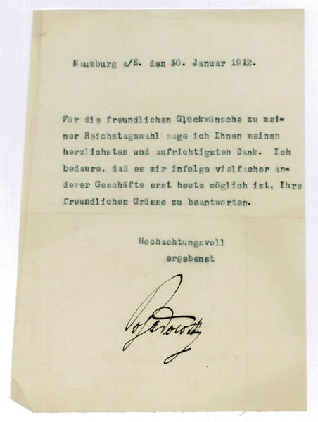 1 S. Gr.-8vo. Mit einer Beilage (s. u.). An einen namentlich nicht genannten Adressaten: "Für die freundlichen Glückwünsche zu meiner Reichstagswahl sage ich Ihnen meinen herzlichsten und aufrichtigsten Dank [.]". - "Posadowsky gehörte zu den profiliertesten Politikern im deutschen Kaiserreich" (NDB XX, 646) und führte etwa die Sonn- und Feiertagsruhe für Arbeiter im Industrie- und Baubereich ein, verbot die Kinderarbeit unter 13 Jahren, und verbesserte den Mutterschutz und untersagte die Nachtarbeit. "Die von ihm vertretene Sozialpolitik strebte die Integration der Arbeitnehmerschaft in die bestehende Gesellschaftsordnung an und verfolgte damit das dringendste politische Ziel der Zeit" (ebd., 647). - Mit kleinen Randläsuren; beiliegend ein eh. adr. Absenderzettel an Frl. Marie von Bunsen.