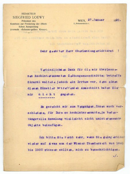 1½ SS. auf Doppelblatt. Kl.-4to. An einen namentlich nicht genannten Oberlandesgerichtsrat: "Verbindlichsten Dank für die mir überlassenen hochinteressanten Zeitungssausschnitte; betreffs Girardi waltete jedoch ein Irrtum vor, denn einen diesen Künstler betreffenden Ausschnitt haben Sie mir nicht gegeben [.] Ich bitte Sie recht sehr, wenn Sie gelegentlich wieder auf etwas aus der Wiener Theaterzeit von 1860 bis 1900 stossen sollten, mich zu benachrichtigen [.]". - Siegfried Löwy war Mitarbeiter der "Morgen-Post" und Korrespondent des "Berliner Börsen-Couriers" sowie der "Frankfurter Nachrichten". Mit der Gründung der "Oesterreichischen Volks-Zeitung" 1888 übernahm Löwy die Leitung des Wirtschaftsteils, begann aber sich vermehrt für Theater und Lokalgeschichte zu interessieren und publizierte darüber im "Neuen Wiener Journal", dem "Neuen Wiener Tagblatt", in der "Neuen Freie Presse", der "Österreichischen Rundschau" u. a. Engere Freundschaft verband ihn mit Alexander Girardi und Johann Strauss (Sohn), und auch unterstützte er Felix Salten bei der Gründung des ersten österreichischen Kabaretts "Jung-Wiener Theater zum lieben Augustin" und setzte sich für die Errichtung der Denkmäler in Wien für Ferdinand Raimund (1898), Josef Kainz (1911), Alexander Girardi (1929) und für das Johann-Strauß-Denkmal (1921) ein. - Auf Briefpapier mit gedr. Briefkopf; mit kleinen Randaus- und -einrissen bzw. -läsuren.