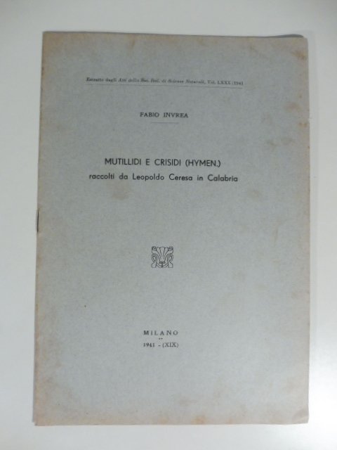 Mutillidi e crisidi (hymen.) raccolti da Leopoldo Ceresa in Calabria | Libri antichi e moderni | Invrea Fabio