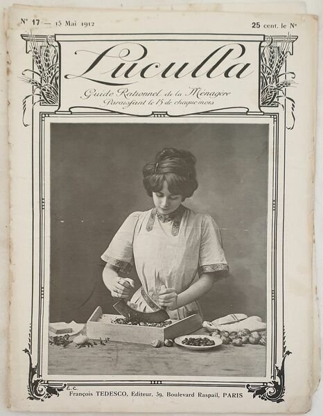 Numero del 15 maggio 1912 di questa rivista gastronomica francese "Luculla". All'interno: lista dei negozi di alimentari, tantissime ricette salate e dolci (patate economici, patate fini in quenelle, pomodori alle uova fredde, befsteak grigliago BOurdelaise, agnello fritto, scaloppe di fegato all'ungherese, pate di volatili, asparagi in ragu, asparagi in timballo, gateau, composta di fragole, crema al cioccolato, gateaux alla frutta) ricetta fotografica delle meringhe, menu di stagione, ricette per gli anemici ecc. Numerose illustrazioni e foto d'epoca, pubblicita d'epoca. Copertina editoriale in discrete condizioni con usure ai margini e dorso. Piatto anteriore quasi staccato. Corpo della rivista staccata dalla copertina. Legatura in buone condizioni. Pagine in buone condizioni con fioriture. In 4. cm. 30,5x23. Pp. da 81 a 100+(4). Number of the 15th of april 1912 of this french gastronomic magazine "Luculla". Inside: list of food shop, many recipes also of sweets (patate economici, patate fini in quenelle, pomodori alle uova fredde, befsteak grigliago BOurdelaise, agnello fritto, scaloppe di fegato all'ungherese, pate di volatili, asparagi in ragu, asparagi in timballo, gateau, composta di fragole, crema al cioccolato, gateaux alla frutta) photographed recipe of meringhe, seasonal menus, recipes for anemic ecc. Different illustrations and photos, advertisings. Editorial cover in fair conditions lightly worn in the extremities. Front plate is almost detached. the body fo the magazine detached from the cover. Binding in good conditions. Pages in good conditions with foxing. In 4. cm. 30,5x23. Pp.from 81 to 100+(4).