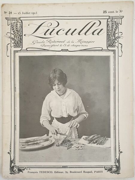 Numero del 15 luglio 1913 di questa rivista gastronomica francese "Luculla". All'interno: lista dei negozi di alimentari, tantissime ricette salate e dolci (canape napoletani, zuppa parmense, uova farcite all'uccello, carpe alla marinara, curry di pesce, vitello al gratin, cotolette di montone glassate, pollo al curry, pate di piccioni, funghi grigiliati, banane fritte, flan alle fragole, uova alla portoghese, uova alle mandorle, uova alla trippa, ricette per i più piccoli ricetta fotografica del plum cake,conserve confetture e sciroppi, pesce di mare ecc. Numerose illustrazioni e foto d'epoca, pubblicita d'epoca. Copertina editoriale in discrete condizioni con usure ai margini e dorso. Legatura in buone condizioni. Pagine in buone condizioni con fioriture. In 4. cm. 31x23. Pp. da 147 a 166+(4). Number of the 15th of july 1913 of this french gastronomic magazine "Luculla". Inside: list of food shop, many recipes also of sweets (canape napoletani, zuppa parmense, uova farcite all'uccello, carpe alla marinara, curry di pesce, vitello al gratin, cotolette di montone glassate, pollo al curry, pate di piccioni, funghi grigiliati, banane fritte, flan alle fragole, uova alla portoghese, uova alle mandorle, uova alla trippa, ricette per i più piccoli) photographi recipe of plum cake,marmalades and syrups, sea fish ecc. Different illustrations and photos, advertisings Editorial cover in fair conditions lightly worn in the extremities. Binding in good conditions. Pages in good conditions with foxing. In 4. cm. 30,5x23. Pp.from 147 to 166+(4).