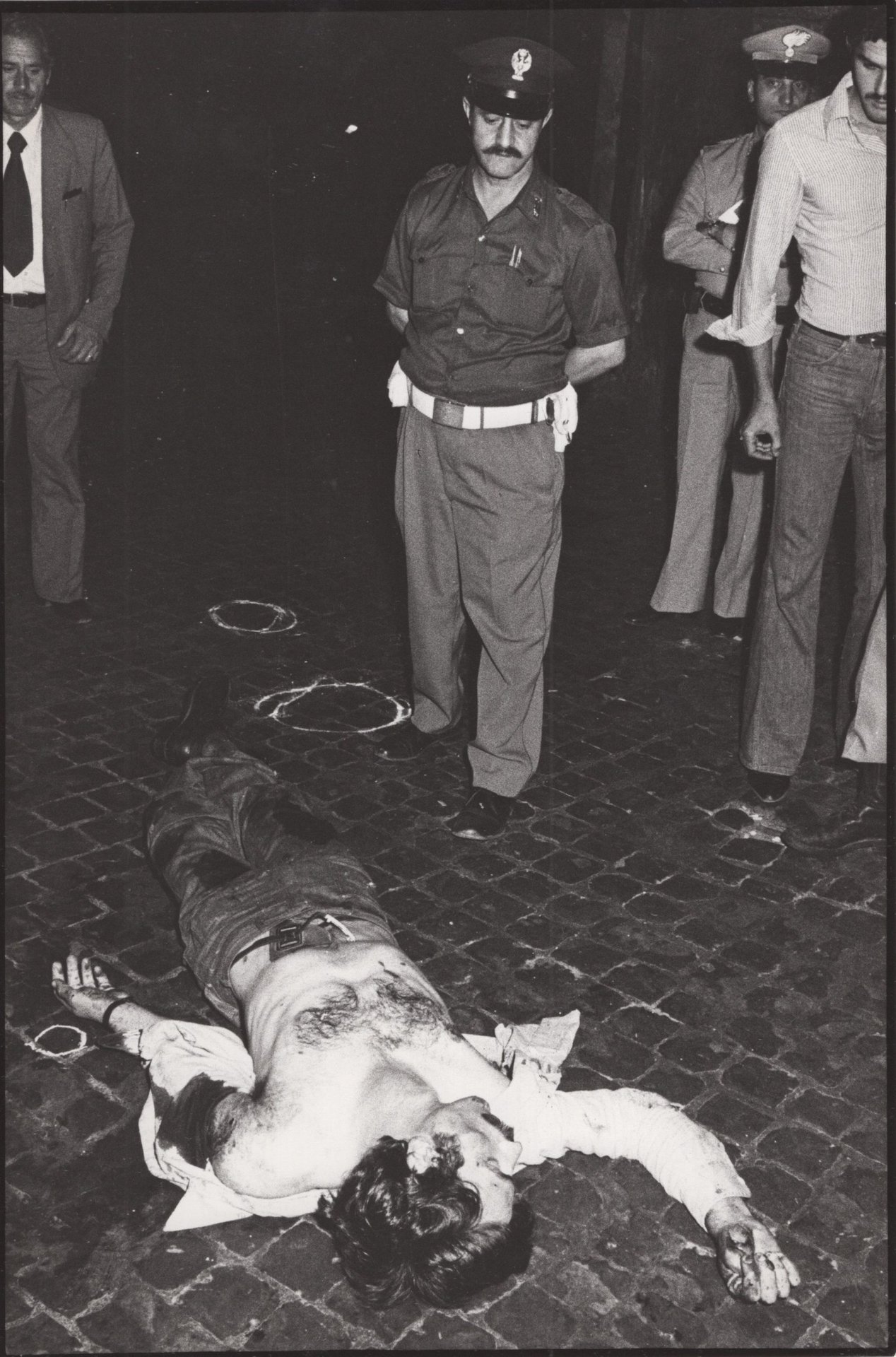 Due fotografie originali, con timbro al verso di Sabatini, raffiguranti il corpo a terra del nappista Antonio Lo Muscio, "falciato da più raffiche di mitra, finito a terra a pistolettate quando era già morto" (dal quotidiano Lotta continua).