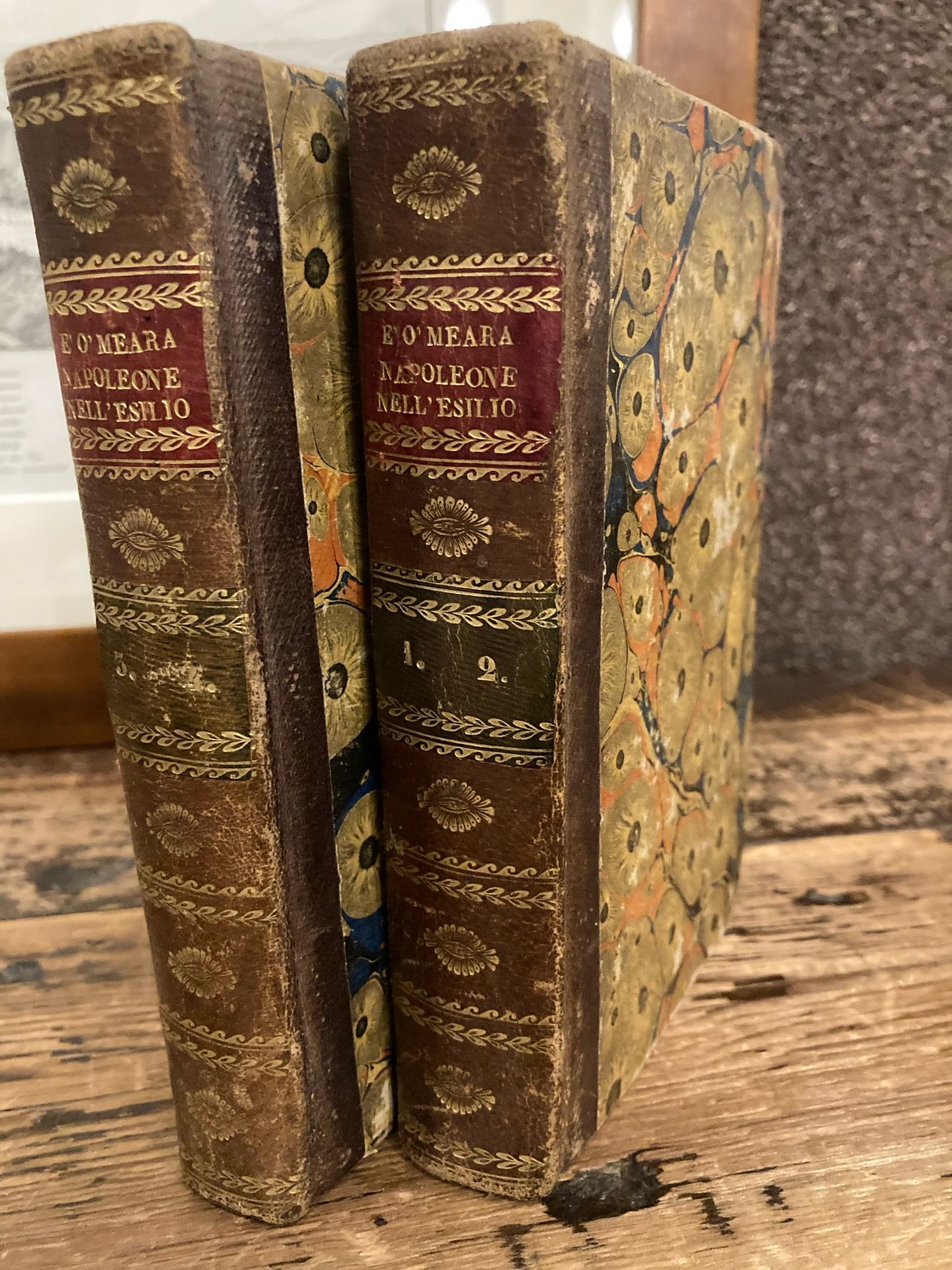 2 voll. in-16° (205x130mm), contenenti 4 tomi: pp. XXV, 372; (2) bianche, 376; (2) bianche, 308; (2) bianche, 275 (3), legatura coeva mezza pelle marrone con angoli, titoli e tomaisons in oro su distinti tasselli ai dorsi lisci adorni di fregi ornamentali in oro, piatti rivestiti bella carta decorata coeva. Lieve alone al margine estero laterale di poche pagine del primo volume. Più che buon esemplare. Non comune edizione italiana condotta sulla seconda originale di questa celebre opera sugli ultimi anni di Napoleone, edita come seguito al 'Memoriale di Sant'Elena' del Las Cases. L'O'Meara (in località ignota dell'Irlanda, 1786-Londra, 1836), irlandese, medico personale di Napoleone a Sant'Elena sino al luglio del 1818, lasciò una delle più interessanti testimonianze rese in prima persona sulla vita privata di Bonaparte, contenente una dura critica alle umilianti disposizioni adottate contro l'imperatore dal governatore di Sant'Elena, Sir Hudson Lowe.
