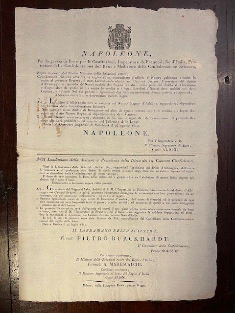 Napoleone, per la grazia di Dio e per le Costituzioni, Imperatore de' Francesi, Re d'Italia, Protettore della Confederazione del Reno, Mediatore della Confederazione Svizzera [.] Art. I. Il diritto d'Albinaggio non si esercita nel Nostro Regno d'Italia Noi Landamano della Svizzera e Presidente della Dieta dei 19 Cantoni Confedrati. [.] Art. I. Gli abitanti del Regno d'Italia, [.], saranno esenti dal diritto d'Albinaggio nei Cantoni Svizzeri [.] | Libri antichi e moderni | Napoleone - Burckhardt, Pietro