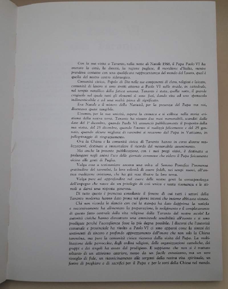 In 4', cart. ed. pp. nn., introduzione di Guglielmo Motolese, Arcivescovo, ill. in n. e col. n.t.; Paolo VI a Taranto. Volume in buono stato, ordinari sefni del tempo. ***Due to bureaucratic reasons, books dated over 70 years old cannot be immediately exported, please contact us before placing the order.***