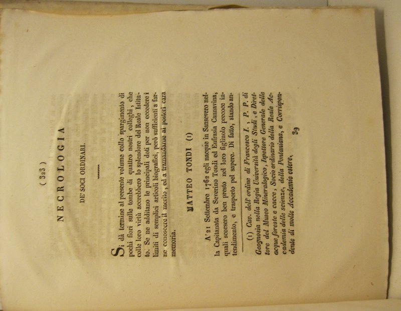 In 8, pp. 323-328. Br. rifatta con carta d'epoca. Stralcio dagli Atti del Real Istituto d'incoraggiamento alle scienze naturali di Napoli, tomo VI. Cenni biblio-biografici relativi alla vita e agli studi di Matteo Tondi, nato a Sansevero nel 1762, chimico e mineralogo. In fine compare l'elenco delle opere edite.