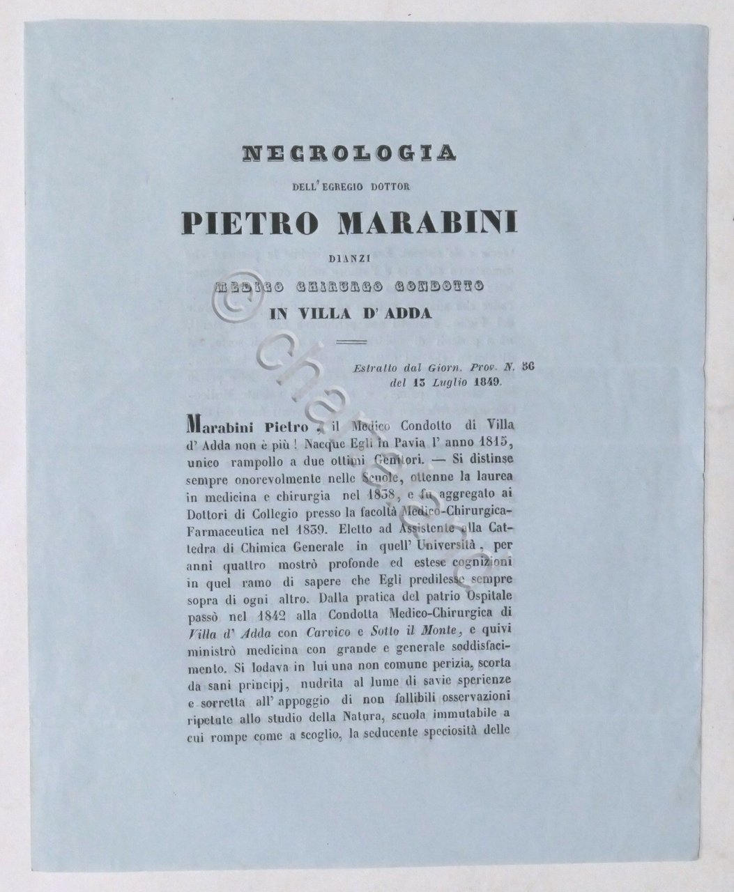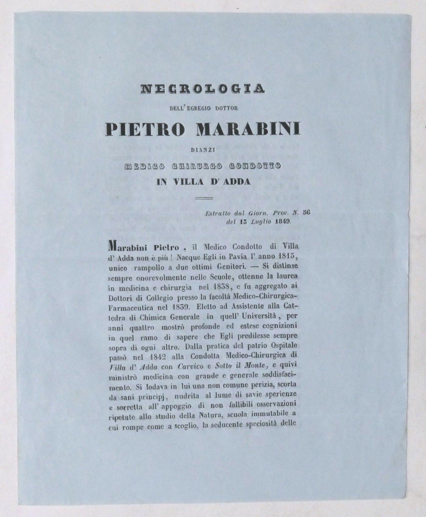 Necrologia per Pietro Marabini medico chirurgo in Villa d'Adda (Bergamo) - 1849 Pag. 3 Lingua italiana. Buone condizioni generali.