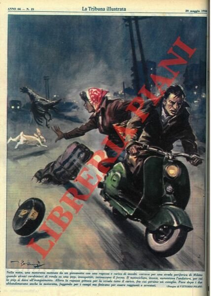 Nella notte, una motoretta montata da un giovanotto con una ragazza e carica di involti correva per una strada periferica di Milano quando alcuni carabinieri di ronda su una jeep, insospettiti, intimavano il fermo. Il motociclista, invece, aumentava l'andatura, per cui la jeep si dava all'inseguimento. Allora la ragazza gettava per la strada tutto il carico, fra cui pesino un coniglio. | Libri antichi e moderni | Pisani Vittorio
