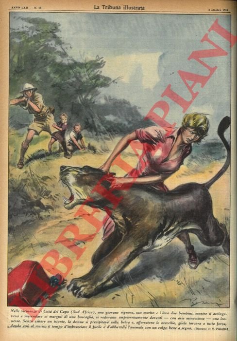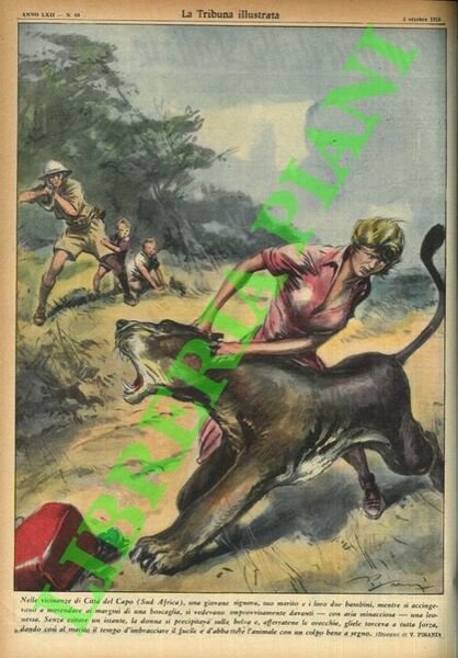 Nelle vicinanze di Città del Capo (Sud Africa), una giovane signora, suo marito e i loro due bambini, mentre si accingevano a merendare ai margini di una boscaglia, si vedevano improvvisamente davanti - con aria minacciosa - una leonessa. Senza esitare un istante, la donna si precipitava sulla belva e, afferratene le orecchie, gliele torceva a tutta forza, dando così al marito il tempo d' imbracciare il fucile e d'abbattere l'animale con un colpo bene a segno. | Libri antichi e moderni | Pisani Vittorio