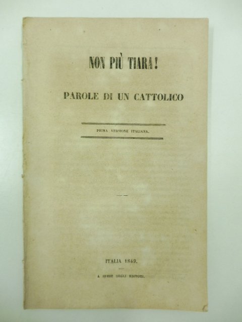 In 16, pp. 43 + (1b). Br. rifatta con carta d'epoca. Libello anticlericale pubblicato anonimo, traduzione italiana dell'originale francese 'Tiare (Plus de)! Par un catholique' attribuito a Louis Allemand e a Felicite' R. Lamennais e messo in seguito all'indice.