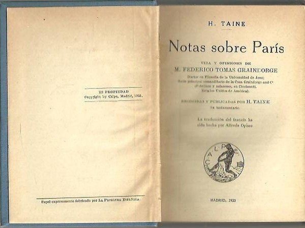 NOTAS SOBRE PARIS. VIDA Y OPINIONES DE M. FEDERICO TOMAS GRAINDORGE. | Libri antichi e moderni | Taine, H.