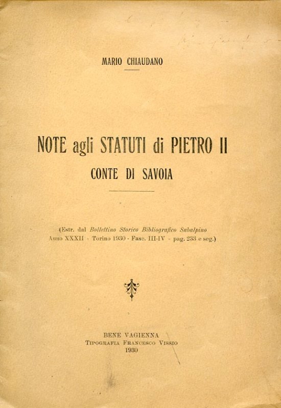 Note agli Statuti di Pietro II Conte di Savoia (Estr. dal Bollettino Storico Bibliografico Subalpino anno XXXII - Torino 1930 - Fasc. III - IV - Pag. 233 e seg.) | Libri antichi e moderni | Chiaudano Mario