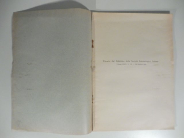 In 8 (cm 17 x 24,5), pagine numerate da 81 a 85. Dedica autografa dell'A. al piato anteriore. Brossura muta coeva. Alone al margine interno delle pagine dovuto a punto metallico. Estratto editoriale dal Bollettino della Societa' entomologica italiana.