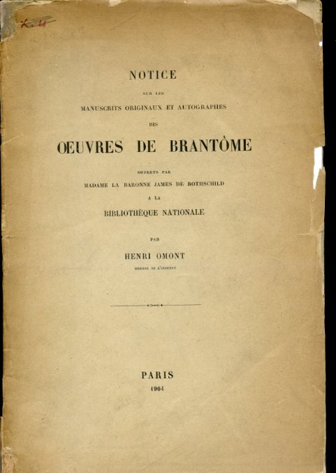 Notice sur les manuscrits originaux et autographes des Oeuvres de Brantôme offerts par Madame la Baronne James De Rothschild a la Bibliothèque Nationale