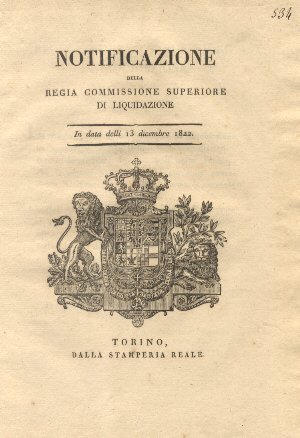 Notificazione della regia commissione superiore di liquidazione con la quale si approvano e sono rese definitive le Liquidazioni a favore de' creditori descritti nell'unito Elenco e si fa premura di prevenire i rispttivi interessati.13 dicembre 1822. | Libri antichi e moderni | Stati Sardi - Notifica.