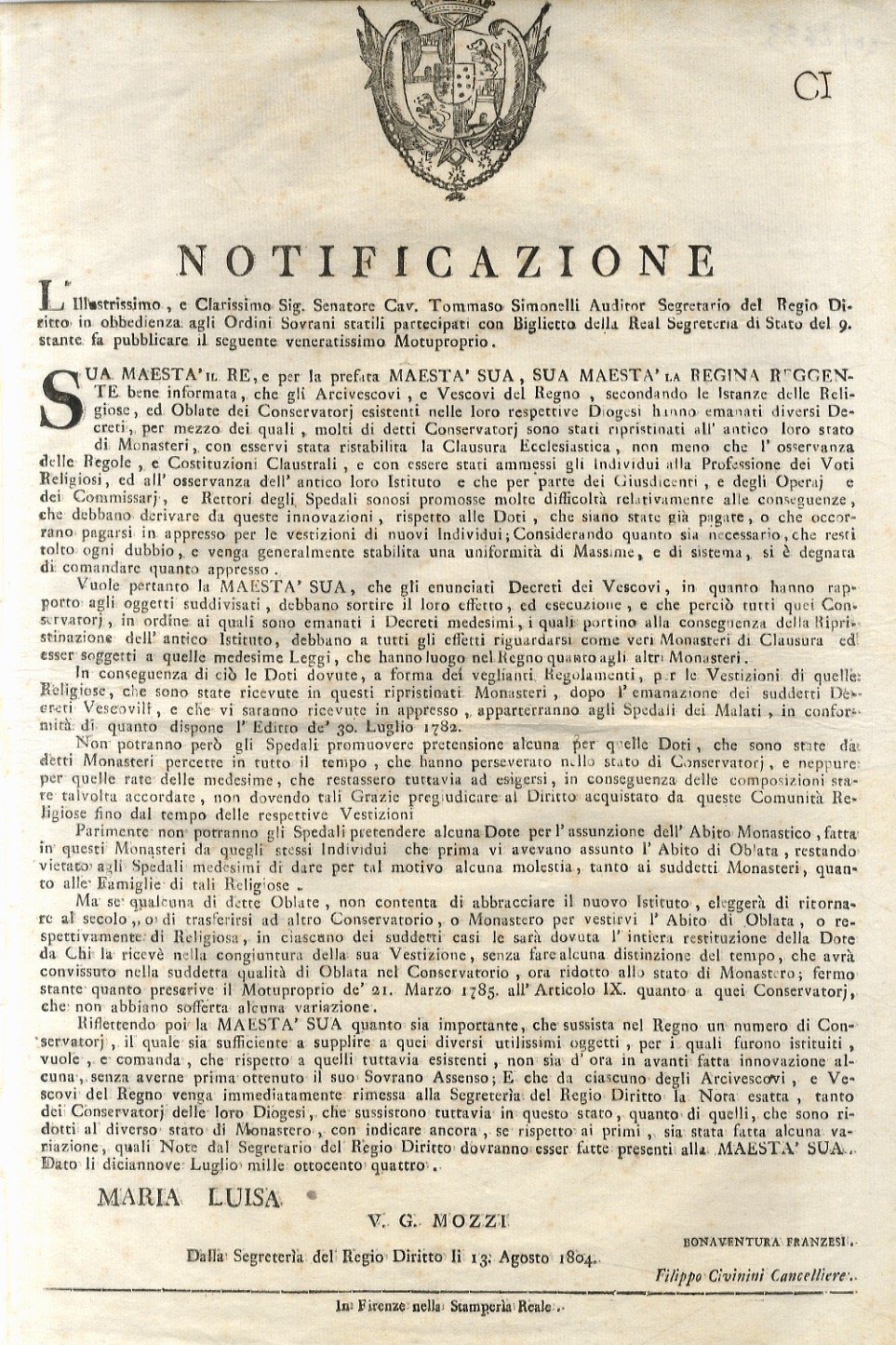 “notificazione”. S.M. il Re, e per la prefata M.S., S.M. la Regina Reggente bene informata, che gli Arcivescovi e Vescovi del Regno, secondando le Istanze delle Religiose, ed Oblate dei Conservatori. hanno emanati diversi Decreti, per mezzo dei quali, molti Conservatori, sono stati ripristinati all'antico loro stato di Monasteri, con esservi stata ristabilita la, Clausura Ecclesiastica, non meno che l'osservanza delle Regole, e Costituzioni Claustrali. Firmato in calce: MARIA LUISA. V.G. Mozzi, Bonaventura Franzesi. Filippo Civinini, Cancelliere.