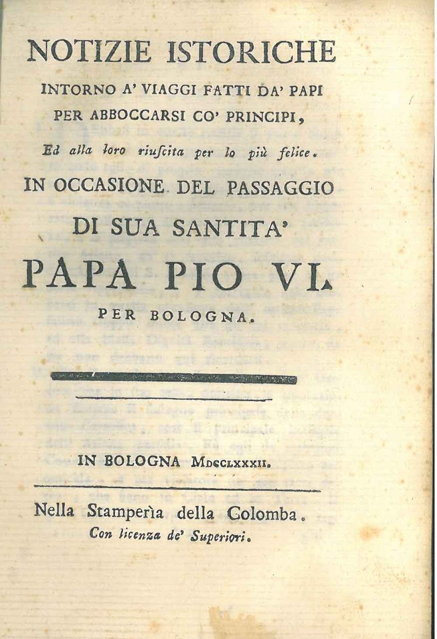 Notizie istoriche intorno a' viaggi fatti da' Papi per abboccarsi co' Principi, ed alla loro riuscita per lo più felice. In occasione del passaggio di sua santità Papa Pio VI. per Bologna | Libri antichi e moderni |