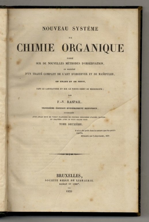 Nouveau système de Chimie organique fondé sur le nouvelles méthodes d'observation, et précédé d'un Traité complet de l'art d'observer et de manipuler, en grand et en petit, dans le laboratoire et sur le porte-objet du microscope. 3ème édition entièrement refondue (.) Tome IIème. | Libri antichi e moderni | Raspail François Vincent.