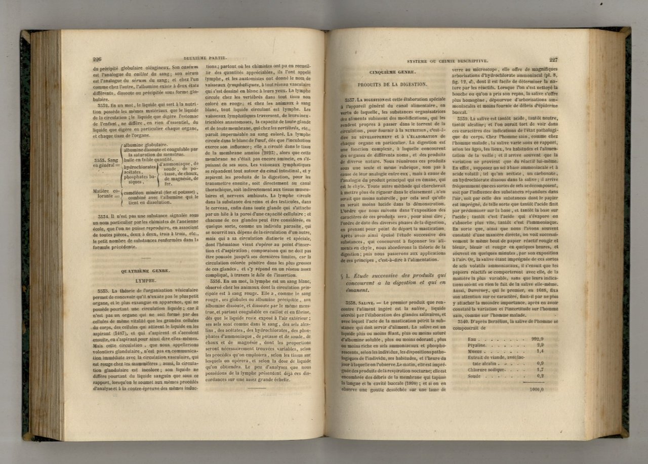 Bruxelles, Société Belge de Librairie Hauman et Comp.e, 1839, in-8, mezzo marocchino verde, dorso a 4 nervi con titolo oro, pp. (4) 492. In questo tomo vengono trattate sia sostanze vegetali quali: gomme, zuccheri (di canna, barbabietola, uva, miele, manna, lattosio, liquerizia, ecc.), olii e grassi (e derivati come sapone e cere), resine, materie coloranti, ecc., che animali: sangue, succhi gastrici, bile, lacrime e sudore, latte (anche umano e colostro), ecc; una sezione dedicata agli alcaloidi (morfina, codeina, stricnina, ecc.) Mancano il Tomo I e l'Atlante contenente 20 taole. Ottime condizioni.