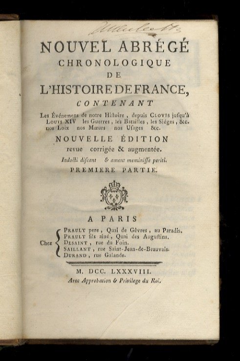 Nouvel abrégé chronologique de l'Histoire de France. Contenant les événemens du notre Histoire, depuis Clovis jusqu'à Louis XIV, les Guerres, les Batailles, les Sièges, nos Loix, nos Moeurs, nos Usages. Nouvelle édition, revue, corrigée & augmentée.