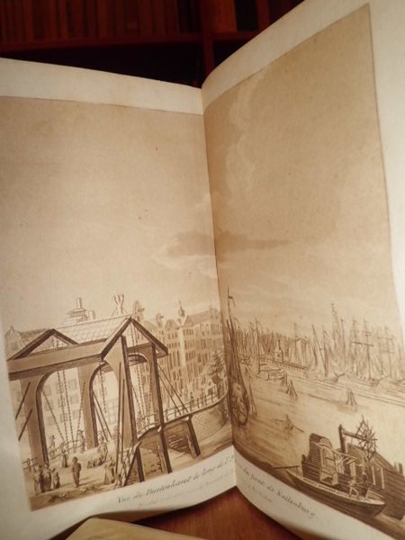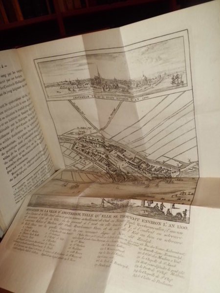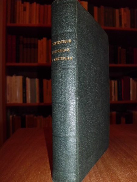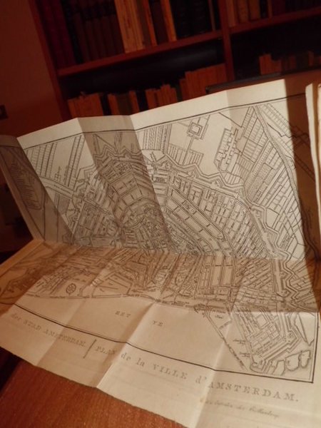 Nouvelle statistique historique d' Amsterdam ou le guide du voyageur en cette ville dans laquelle on traite de l' origine de cetté ville, des événemens qui s'y sont passés, de son accroissement, du nombre, des moeurs et des usages des habitans, tant anciens que modernes, de la description des édificies publics avec tout ce qu'ils offrent de plus remarquable, etc. Amsterdam, E. Maaskamp, s.d. (sec. XVIII). In - 8°, tutta tela coeva. viii, 355, (1) pp. con due pianta della città ripiegata f.t. e 13 tavole a doppia pagina f.t., delle quali 12, incise in rame in seppia all' acquatinta, raffigurano belle caratteristiche vedute della città. Ottimo esemplare.