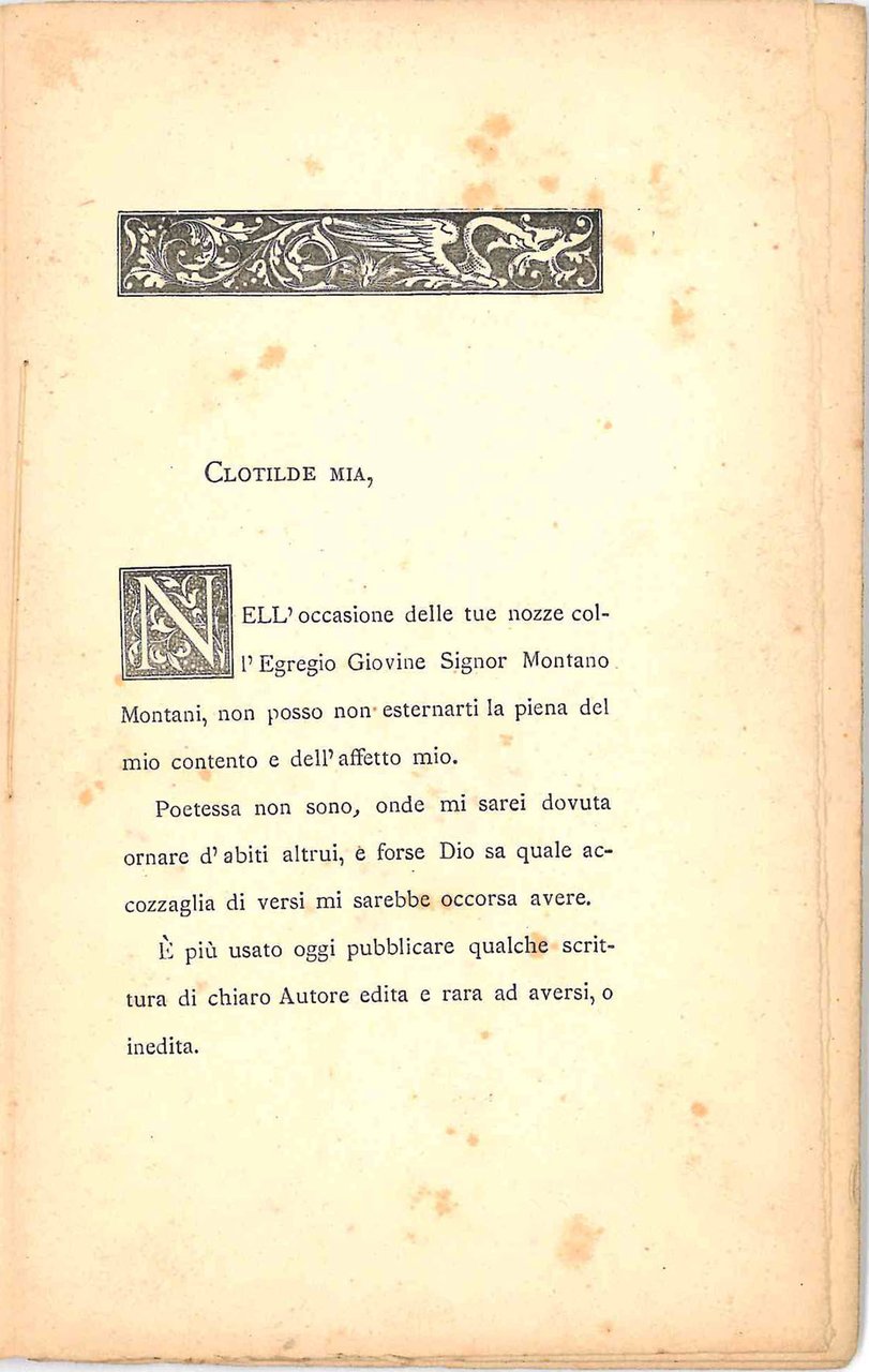 Mm. 162 x 200. Pp. 32, [2]. Brossura coeva a stampa. Diversi fregi xilografici. Carta brunita e con alcune fioriture, parzialmente slegato. Dedica alla sposa Clotilde Caraciotti dalla sorella Ottavia Mezucelli Caraciotti, firmata da Teramo in data 20 novembre 1880. Ottavia sceglie un manoscritto inedito di Alessio Tulli, di cui pubblica quindi la dedica introduttiva e due componimenti: Alle nobili donzelle mie concittadine; L'oracolo delle mogli; L'oracolo dei mariti.
