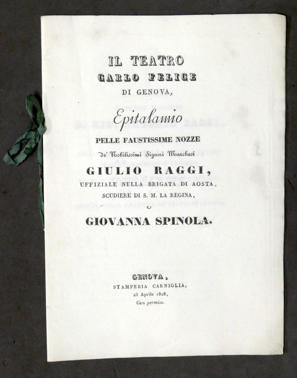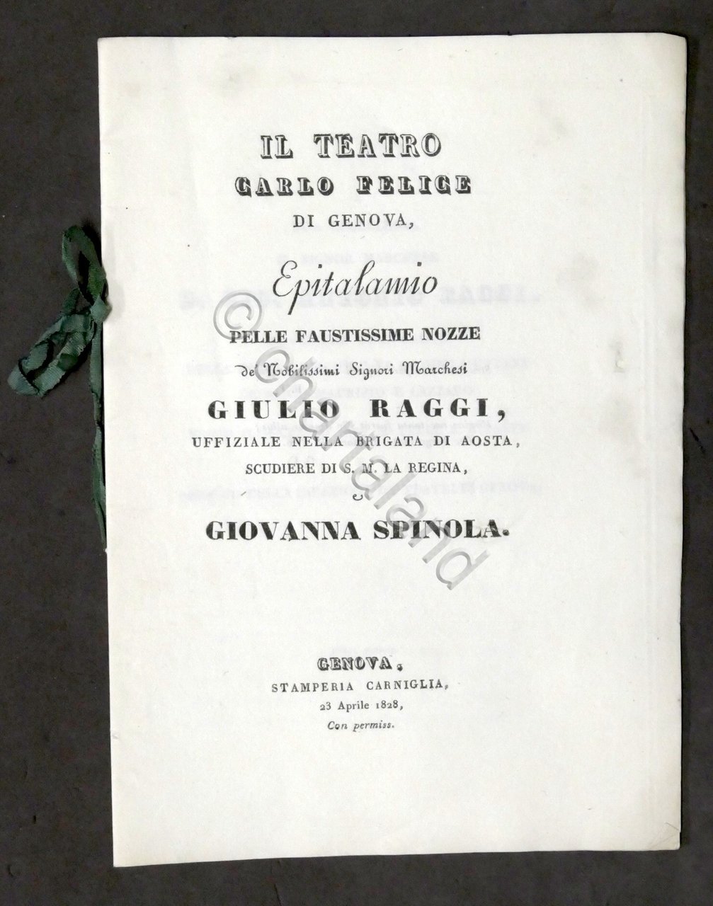 Nozze Giulio Raggi e Giovanna Spinola - Epitalamio - Teatro Carlo Felice 1828 | Libri antichi e moderni |